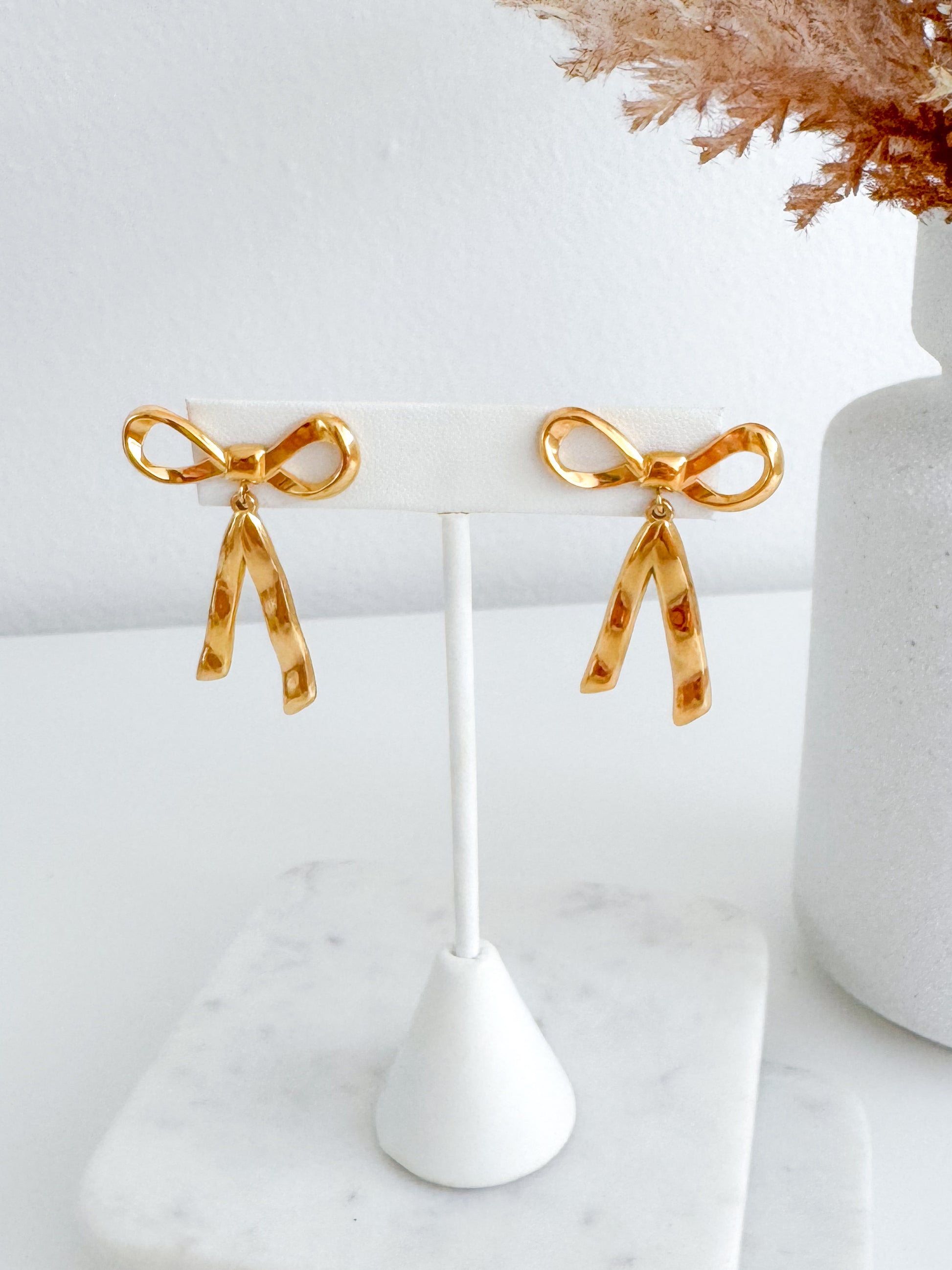These chic bow earrings add a playful touch to any outfit. Made with lightweight golden stainless steel, they won't weigh you down. Perfect for the coquette in all of us.