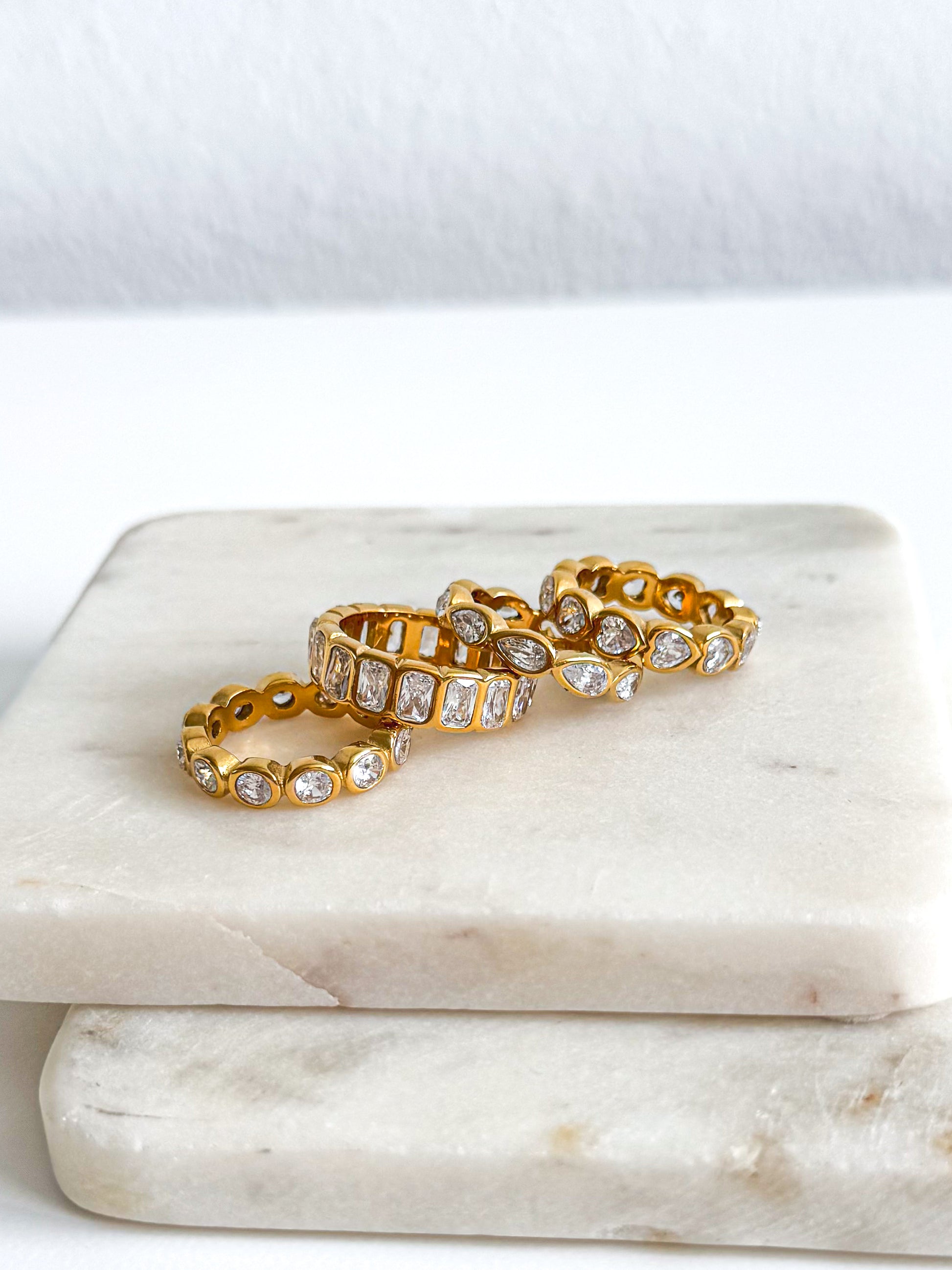 Cada sortija está diseñada con zirconias cúbicas a vuelta completa, creando un destello continuo que ilumina cada movimiento de tu mano.