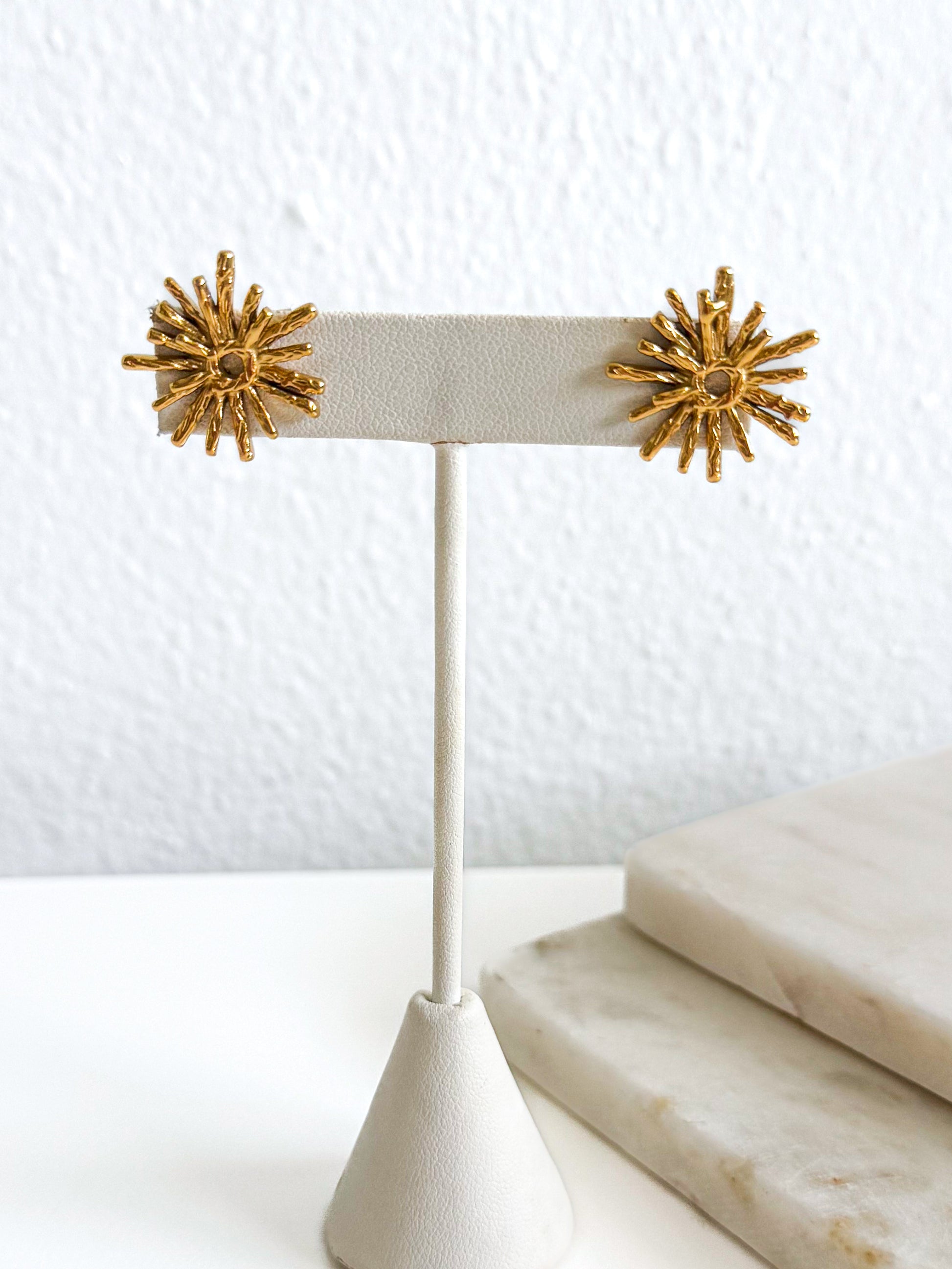 Pantallas estilo studs con un diseño circular de rayas texturizadas que nacen desde el centro, creando un efecto de rayos que simboliza energía, renovación y poder interior. Una pieza que acompaña tu esencia con sutileza y presencia, perfecta para llevar a diario como un recordatorio de tu luz interior y tu proceso de evolución personal.